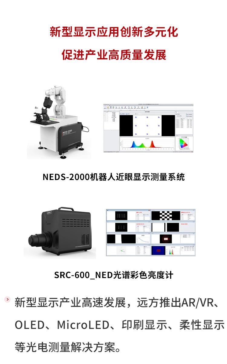 近眼显示测量解决方案覆盖Micro LED/OLED微显示屏、光引擎、背光模组、成品眼镜的亮度、色度及其均匀性、图像对比度、FOV、Eye-box、图像畸变、MTF等常规光色电参数,显示材料透过率雾度等参数的全面检测。不仅适用于实验室测量,也可应用于生产线中光学品质控制,满足IDMS、IEC、GB等国际及国内标准的测试要求。