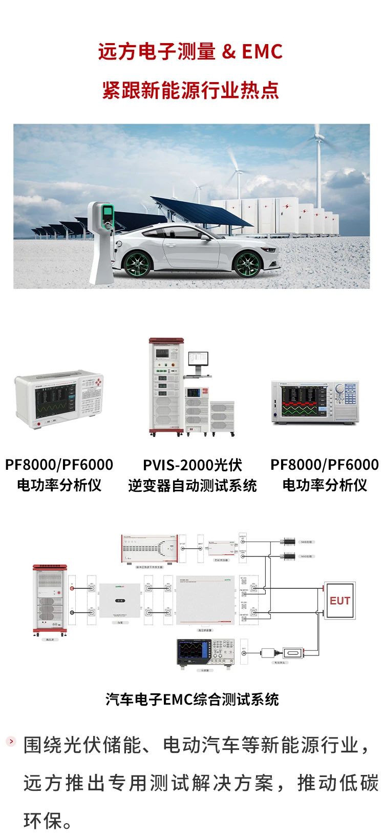 全球新能源汽车产业发展驶入快车道,新产品新技术加快研发运用,技术创新带动产业持续升级。远方针对新能源汽车包括动力电池、车载充电机、驱动电机和控制器以及充电桩等,提供整套测试解决方案。